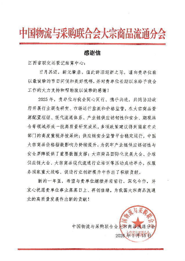 近日,江西聯(lián)交運(yùn)先后收到來(lái)自中國(guó)物流與采購(gòu)聯(lián)合會(huì)大宗商品流通分會(huì)和江西省地方金融管理局發(fā)來(lái)的感謝信,分別對(duì)公司在推動(dòng)大宗商品行業(yè)發(fā)展與創(chuàng)新等方面發(fā)揮的積極作用以及對(duì)公司及選派優(yōu)秀員工在支持配合防范非法集資、建設(shè)非現(xiàn)場(chǎng)監(jiān)管模塊等工作中的擔(dān)當(dāng)作為和有力支持表示充分肯定與感謝。