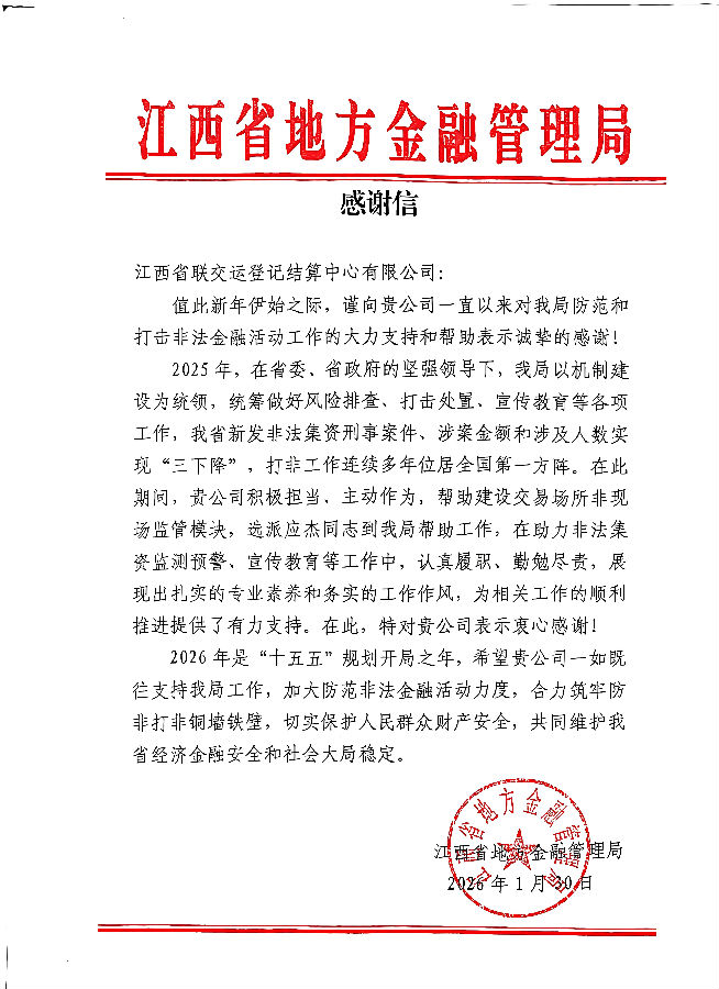 公司連續(xù)多年收到中國(guó)物流與采購(gòu)聯(lián)合會(huì)大宗商品流通分會(huì)和江西省地方金融管理局發(fā)來(lái)的感謝信,既是肯定也是勉勵(lì)。我們將繼續(xù)聚焦“走在前、勇?tīng)?zhēng)先、善作為”的目標(biāo)要求,緊扣我省“防風(fēng)險(xiǎn)、強(qiáng)監(jiān)管、促高質(zhì)量發(fā)展”地方金融管理工作主線,在圍繞中心、服務(wù)大局中有效發(fā)揮地方金融基礎(chǔ)設(shè)施平臺(tái)職能作用,加快加大金融科技與監(jiān)管科技在地方金融領(lǐng)域的創(chuàng)新實(shí)踐步伐,為促進(jìn)地方金融行業(yè)穩(wěn)定與發(fā)展作出新的的更大貢獻(xiàn)。