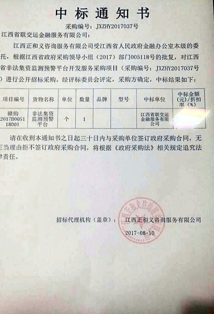 2017年8月9日,江西省聯(lián)交運(yùn)金融服務(wù)有限公司(以下簡(jiǎn)稱“公司”)成功中標(biāo)江西省非法集資監(jiān)測(cè)預(yù)警平臺(tái)開發(fā)服務(wù)項(xiàng)目,這標(biāo)志著公司在向江西省地方金融統(tǒng)一監(jiān)管云平臺(tái)的建設(shè)目標(biāo)上又邁出了堅(jiān)實(shí)一步。
