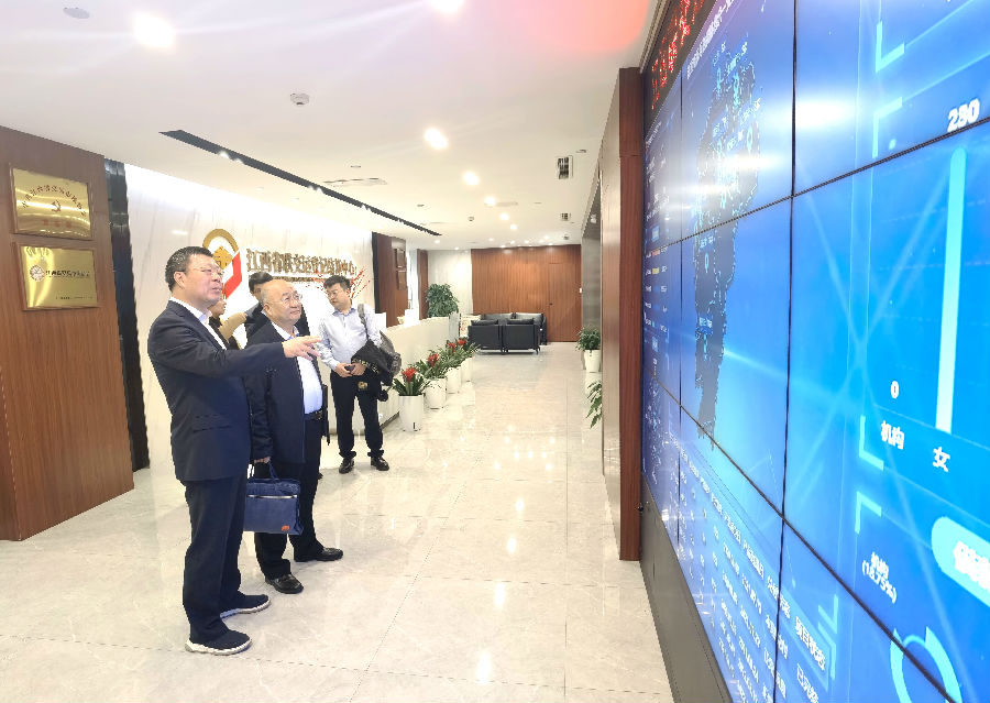 童詠雷一行首先觀摩了公司輔助監(jiān)管信息展示大屏,詳細(xì)了解了公司輔助地方金融監(jiān)管部門(mén)建設(shè)運(yùn)營(yíng)的“贛金鷹眼”、“贛金衛(wèi)士”等信息化監(jiān)管平臺(tái)的管理運(yùn)行情況和創(chuàng)新做法,并給與高度肯定。